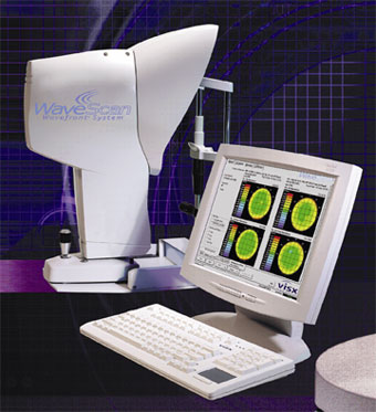 In 2003, wavefront analyzers such as the VISX WaveScan to the left became available. These instruments are low powered lasers that directly scan the eye for the needed correction, without the patient having to answer any of the sometimes frustrating "Which is better, one or two?" questions. In fact, all the patient has to do is look at a little red light and the scanner does the rest.